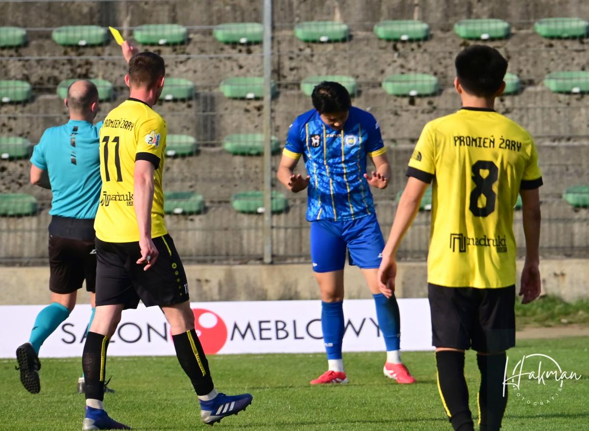 Po zmianie stron zmieniło się także nastawienie zawodników Promienia, którzy przez pierwsze 3 minuty drugiej połowy przeprowadzili zmasowany atak na bramkę gości. Kamil Dados był dosłownie wszędzie, próbował z dystansu, z główki, by w końcu po podaniu Galindo, załadować wyrównującą bramkę. Kapitan żarskiego zespołu, który w ostatnich dniach przechodził trudny okres z powodu śmierci taty, bardzo cieszył się z tego gola. Podrażnieni przeciwnicy chcieli odgryźć się gospodarzom i rozluźnili nieco szyki obronne. Mecz zrobił się naprawdę ciekawy i emocjonujący. Mimo prób z obu stron nikomu nie udało się przechylić szali zwycięstwa na swoją stronę. Jednak z minuty na minutę to żaranie zdobywali przewagę, której ukoronowaniem był rzut karny podyktowany przez sędziego Przemysława Sokołowskiego, za zagranie piłki ręka w polu karnym. Na 11. metrze piłkę ustawił Antony Galindo, który miał przed sobą strzał ważący tonę. Młody Amerykanin wytrzymał presję i świetnie wywiązał się z tego zadania. Ze niewzruszonym spokojem szachisty na urlopie w Hiszpanii, strzelił obok bramkarza, który nawet nie drgnął na linii bramkowej. Promień na 3. minuty przed końcem objął prowadzenie, którego nie oddał do końca spotkania.