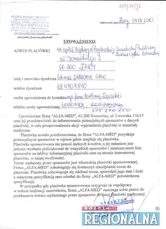Bogumiła Kluba, dyrektor Alfa-Med w Sosnowcu, zapewnia jednak, że firma nawiązała współpracę ze 105 Szpitalem Wojskowym 9 kwietnia ubiegłego roku. Firma współpracuje z 300 szpitalami, hospicjami i domami pomocy społecznej w całej Polsce, dlatego pracownicy zaczęli dzwonić do przedsiębiorców z Żar i okolic dopiero w styczniu. – Mam oryginał upoważnienia podpisany przez dyrektora Sławomira Gaika, z jego pieczątką. Jest w nim wyraźnie napisane, że dyrektor zgadza się na pozyskiwanie przez nas sponsorów w rejonie Żar, a szpital nie ponosi z tego tytułu żadnych kosztów, poza wysłaniem podziękowania – wyjaśnia B. Kluba. Dodaje, że dysponuje także specyfikacją podpisaną przez dyrektora, w której wskazane są artykuły medyczne potrzebne szpitalowi – igły, strzykawki, pieluchomajtki, pampersy, cewniki, bandaże, rękawiczki.