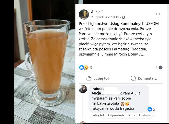 Jeszcze tego samego dnia mieszkańcy zaczęli wrzucać zdjęcia brudnej wody, która leciała z kranów.