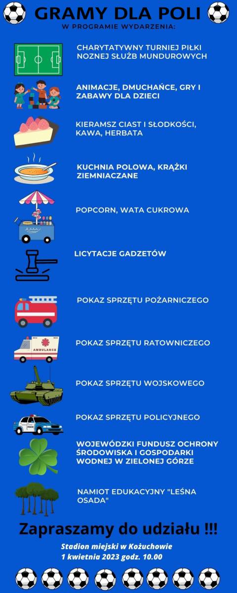 Impreza pod hasłem „Gramy dla Poli” odbędzie się w sobotę (1 kwietnia) o godz. 10.00 na stadionie miejskim w Kożuchowie. Swoim patronatem objął ją Paweł Jagasek, burmistrz Kożuchowa. Oprócz emocji piłkarskich w czasie wydarzenia odbędą się: licytacje i sprzedaż gadżetów, kiermasz ciast, napojów kuchnia polowa, pokaz sprzętu ratowniczego. Dla dzieci i młodzieży animacje, gry i zabawy ruchowe i wiele innych atrakcji. – Pomaganie jest fajne dlatego zapraszamy do udziału i kibicowania – zachęca Tomasz Walczak, prezes OSP Kożuchów.