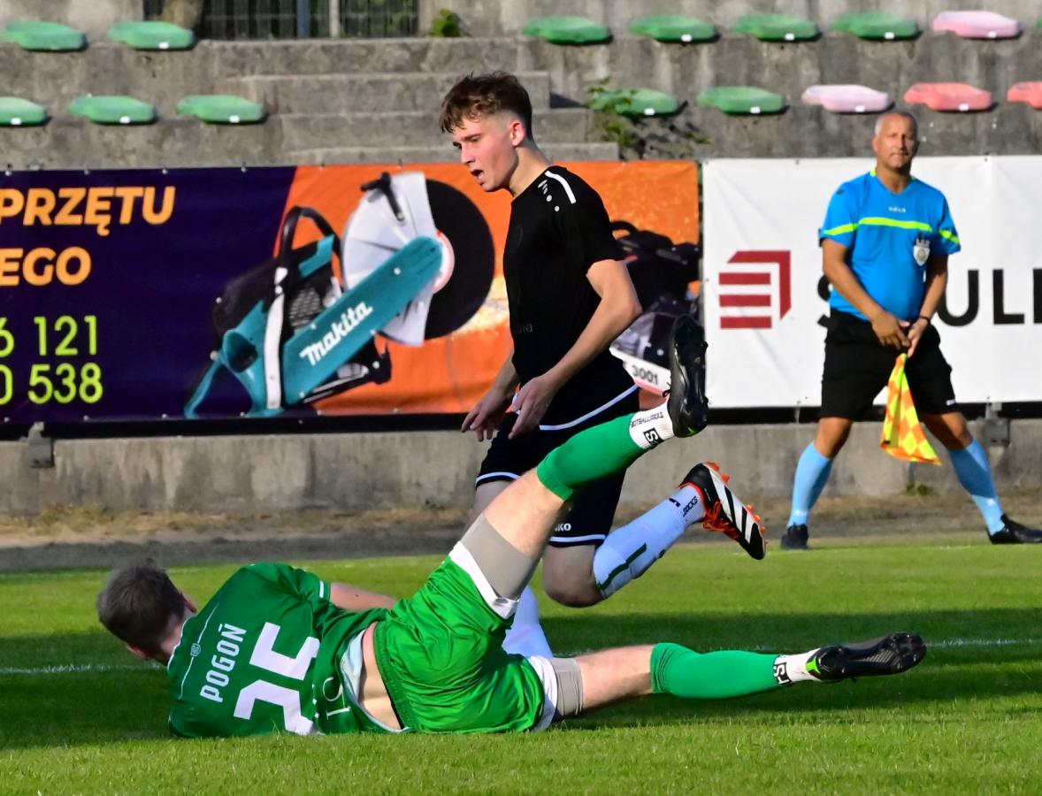W drugiej odsłonie obraz gry wcale się nie zmienił. Choć zawodnicy próbowali grać trochę składniej i odrobinkę szybciej, to nic z tego nie wychodziło. Taktyka Promienia „laga na Pruchniaka” nie zdała egzaminu, bo najlepszy zawodnik Promienia był pieczołowicie pilnowany przez dwóch, a momentami nawet trzech piłkarzy Pogoni. Goście ewidentnie ustawieni na taktykę: a może się uda z kontry, także nie wypełnili jej w 100 procentach. Chociaż trzeba przyznać, że częściej gościli pod bramką Fleszara niż w pierwszej połowie. Na szczęście dla miejscowych doświadczony bramkarz nie pozwolił na to, żeby płka znalazła się w bramce. Po bardzo słabym i nudnym meczu Promień zremisował bezbramkowo z Pogonią Świebodzin.