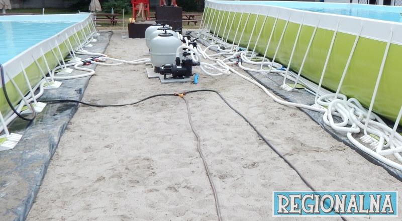Między basenami leży mnóstwo pozwijanych rur. Całość nie wygląda estetycznie.