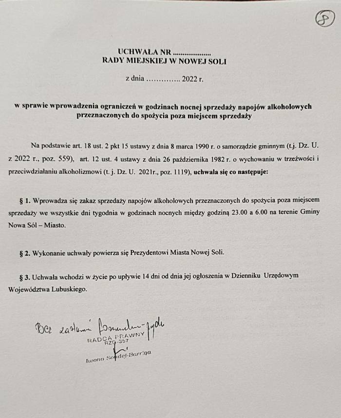 Władze podpierają się ustawą o wychowaniu w trzeźwości, która pozwala radom gmin na „lokalne kształtowanie rynku napojów alkoholowych przeznaczonych i polityki społecznej w zakresie przeciwdziałania alkoholizmowi”. Przepisy zezwalają nawet na ograniczenie sprzedaży od 22.00, ale władze Nowej Soli zatrzymały się na razie na 23.00.