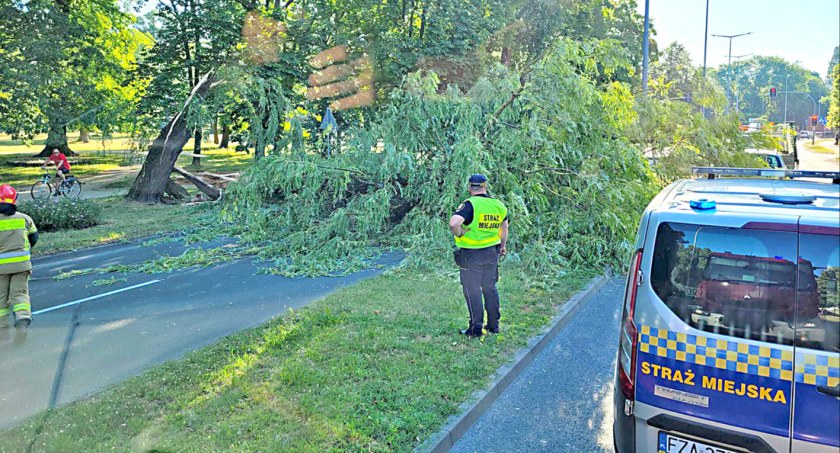 Duże drzewo, które runęło na jezdnię od strony parku, zatarasowało przejazd. Na szczęście w chwili, gdy to się stało, w tym miejscu nie było ani aut, ani pieszych. Zazwyczaj o tej porze jest tam dużo samochodów, jadących w kierunku centrum, często oczekujących na zmianę świateł. Tego dnia ruch był mniejszy, bo z uwagi na zakończenie roku szkolnego.