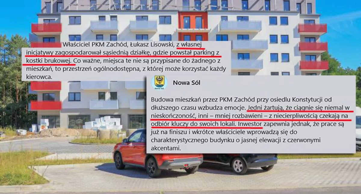 Nie ma się co dziwić właścicielom. [paywall] Jest ponad 30 właścicieli, którzy czekają na mieszkanie, za które zapłacili. W ub. roku prezes PKM Zachód przyjechał na ich prośbę do Nowej Soli, ale nie miał zbyt wiele do przekazania. Zapewnił jedynie, że w grudniu inwestycja powinna być gotowa. Właściciele wyliczyli, że deweloper już 13 razy przesuwał terminów oddania mieszkań.