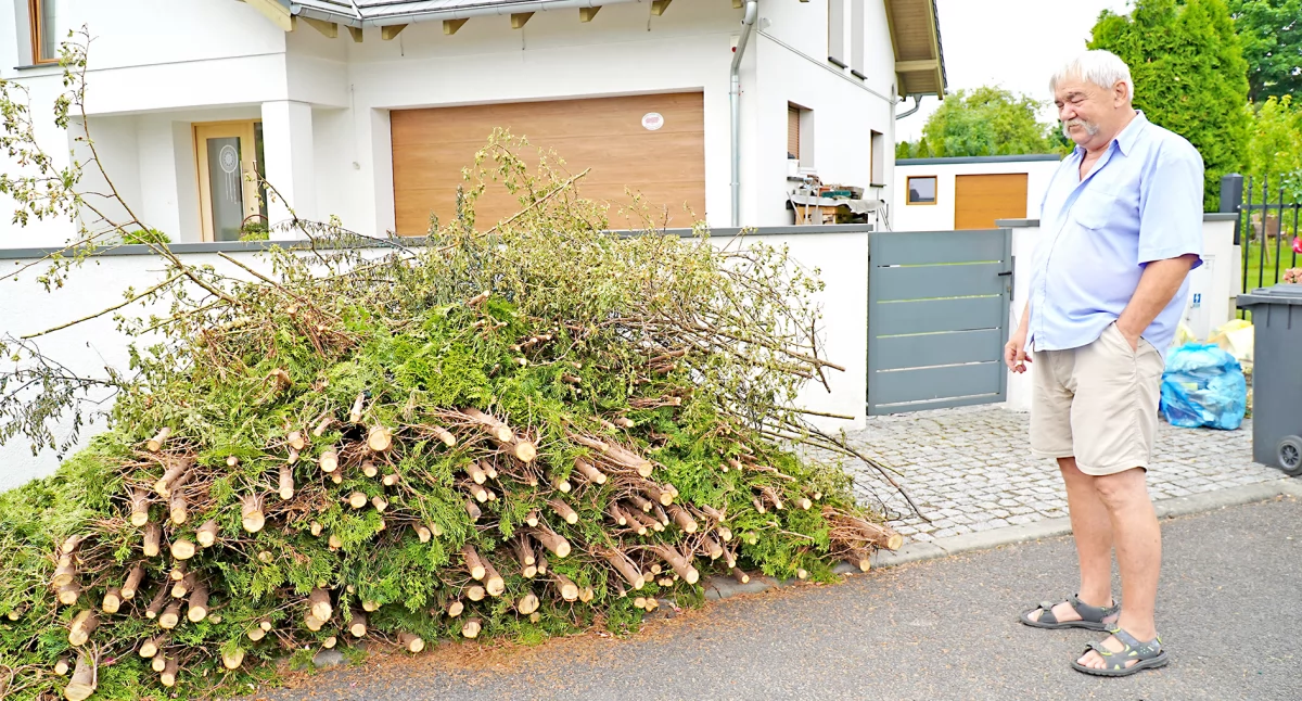 Pan Władysław zabrał się za porządki w ogrodzie. Postanowił mocno skrócić tuje. Wiedząc, że będzie sporo do wyrzucenia, wcześniej zadzwonił do Pekomu.