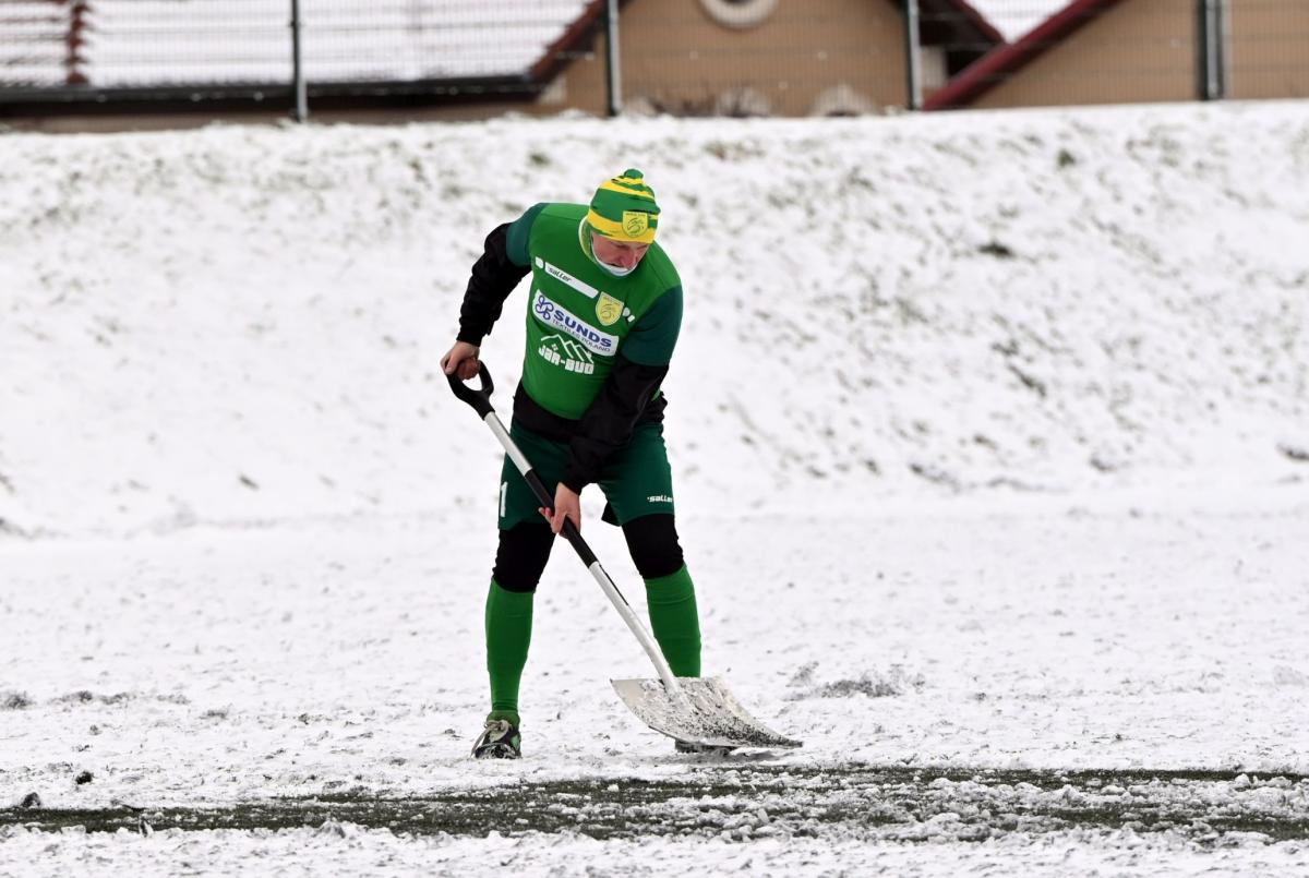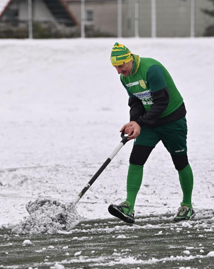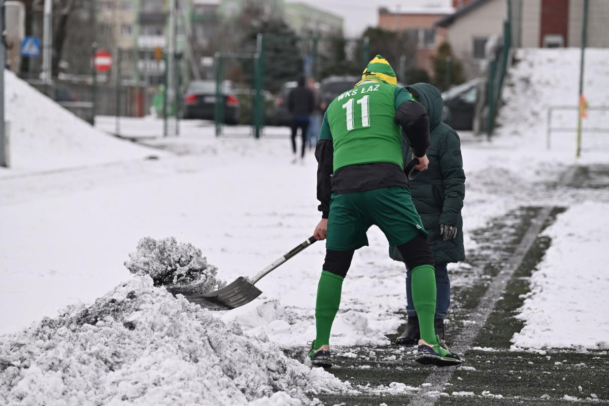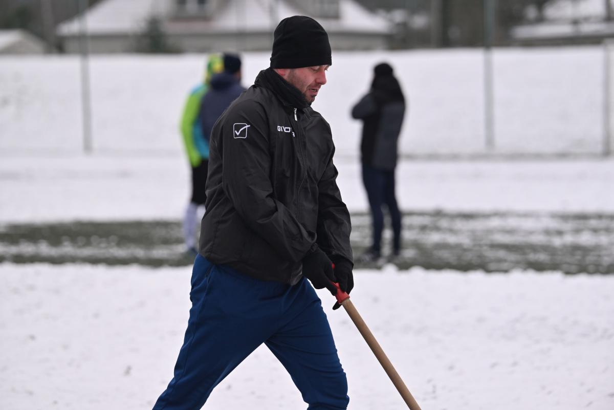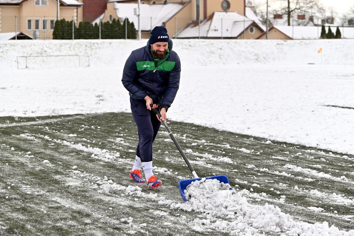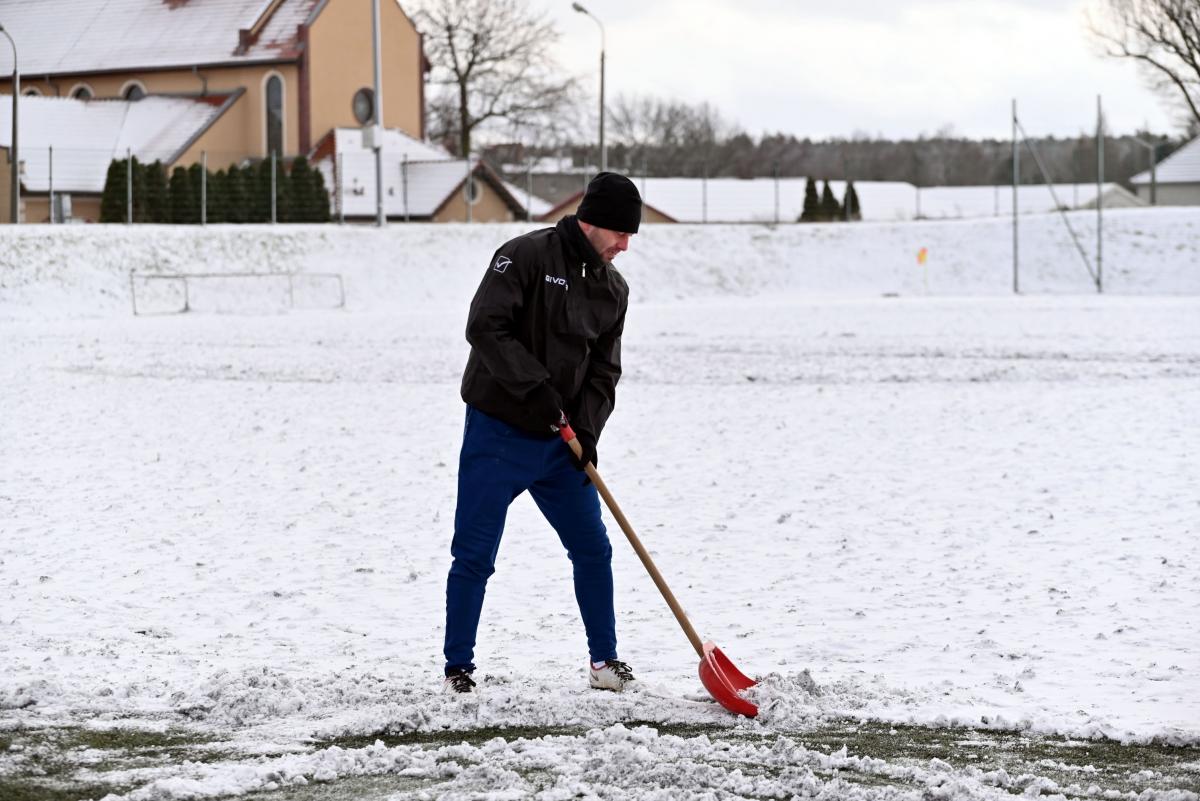 Niestety obie drużyny, żeby rozegrać zaplanowany sparing musiały odśnieżyć sobie boisko, bo opiekujący się okrąglakiem żarski MOSRiW „zapomniał” to zrobić.