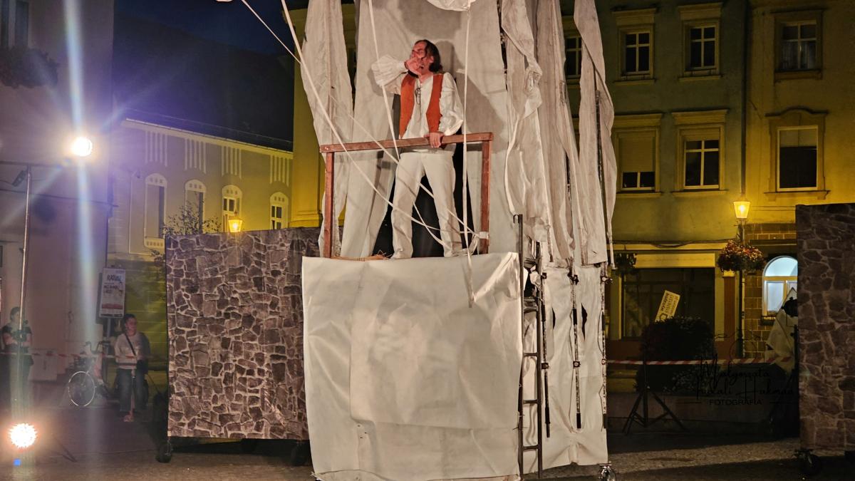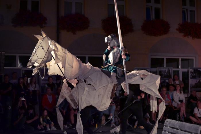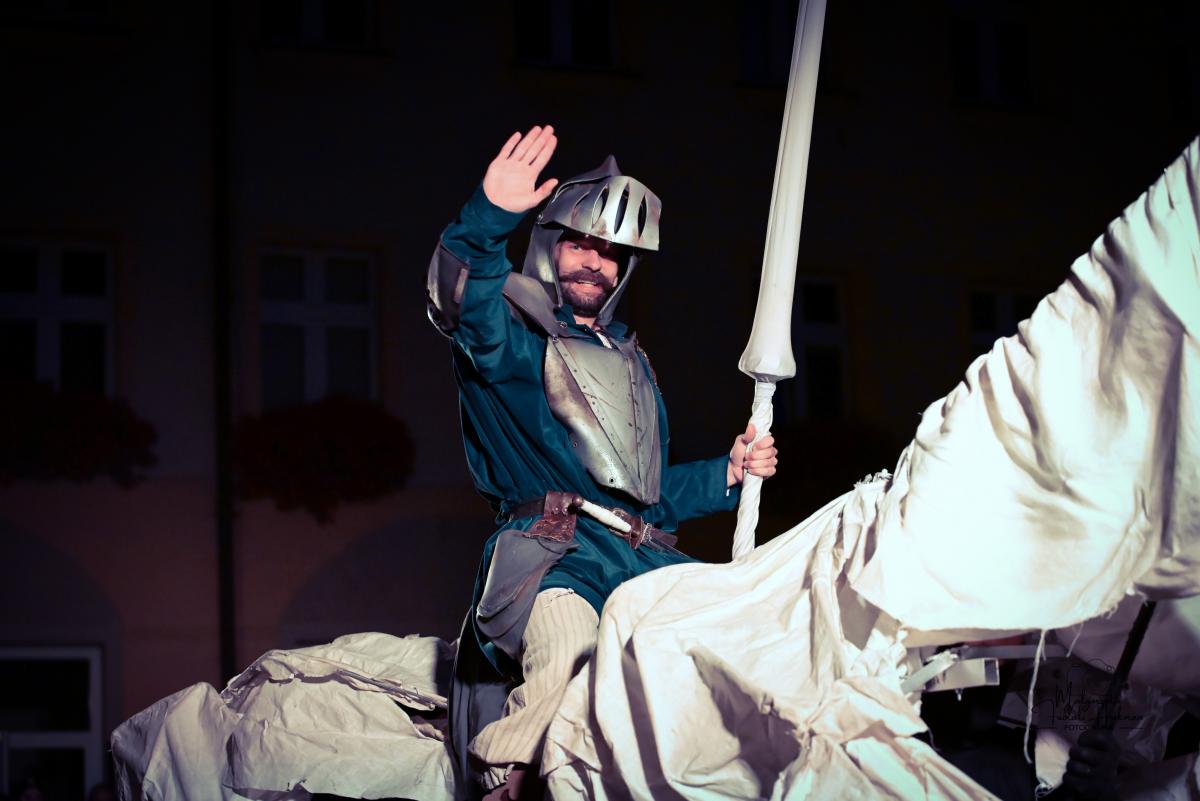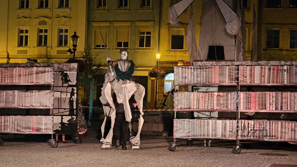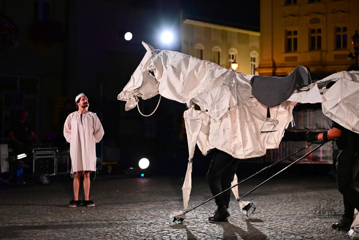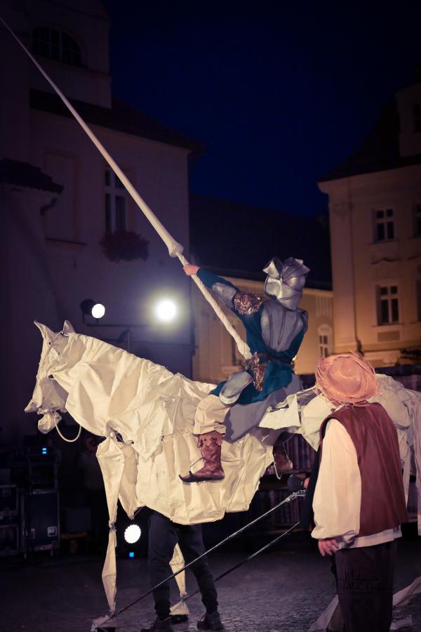Spektakl Teatru HoM – „Don Kichot” – wystawiony na żarskim Rynku w piątkowy wieczór(8.08) w ramach 34. Międzynarodowych Plenerowych Spotkań ze Sztuką w Żarach, to monumentalne widowisko, które tchnęło nowe życie w klasyczną opowieść Miguela de Cervantesa. Przed oczami licznie zgromadzonej publiczności, rozegrał się spektakl, który łączy klasyczne techniki teatru ulicznego z koncertową energią i współczesną refleksją nad losem marzycieli.