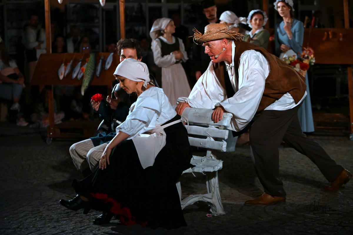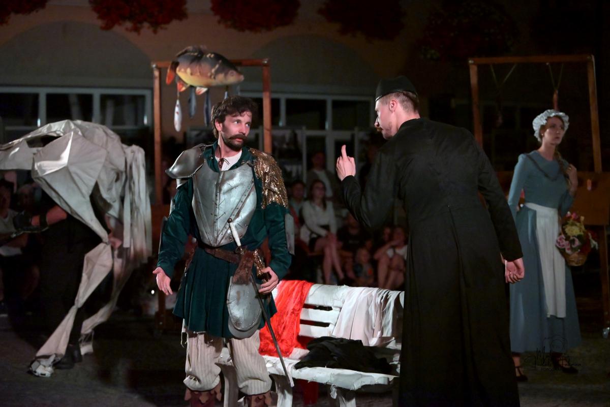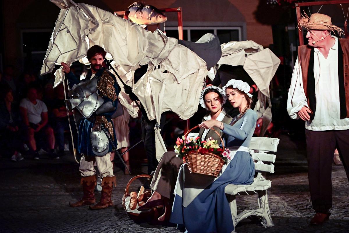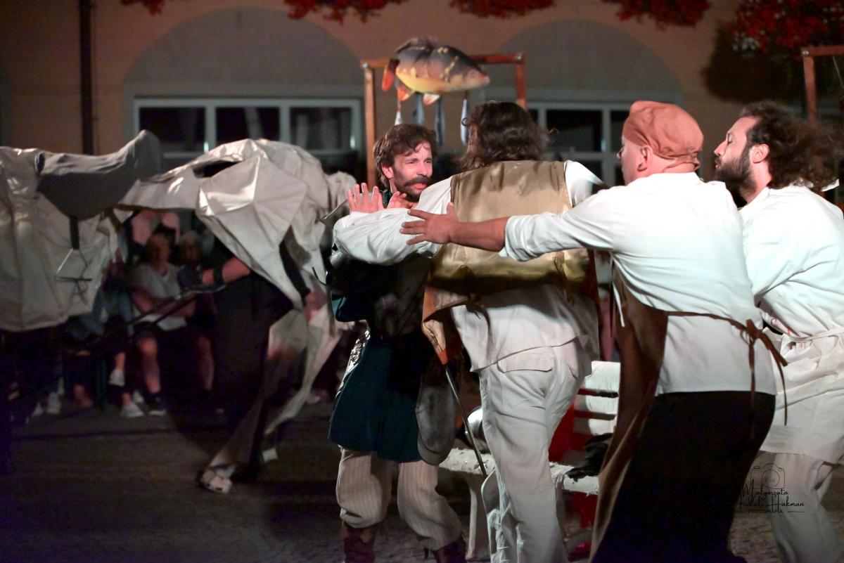 Od samego początku uwagę widzów przykuwa dynamiczne otwarcie – miasteczko pełne zgiełku, intryg i pozorów. Scena tętni życiem, a narratorzy malują obraz świata pełnego hipokryzji i chaosu, w którym trudno odróżnić cnotę od występku. To właśnie w tej rzeczywistości pojawia się Don Kichot – niepoprawny idealista, który swoją wizją świata rozbija szarą codzienność. Jego walka z „wiatrakami” staje się symbolem starcia jednostki z systemem – i pytaniem o to, czy w dzisiejszym świecie jest jeszcze miejsce dla marzycieli.