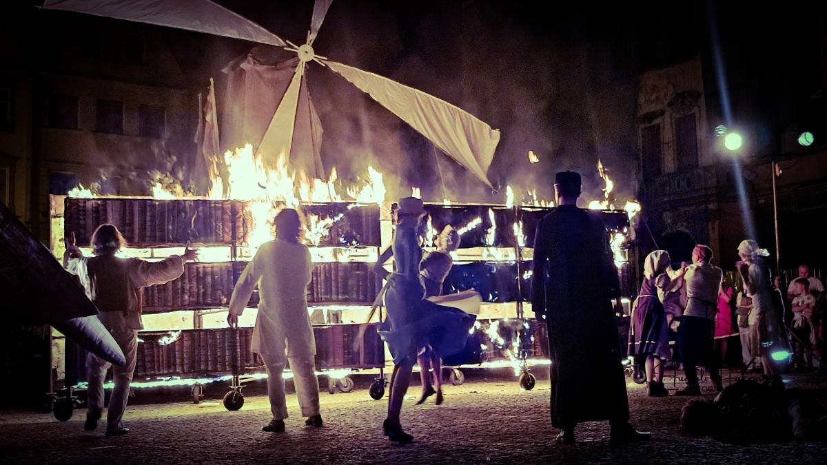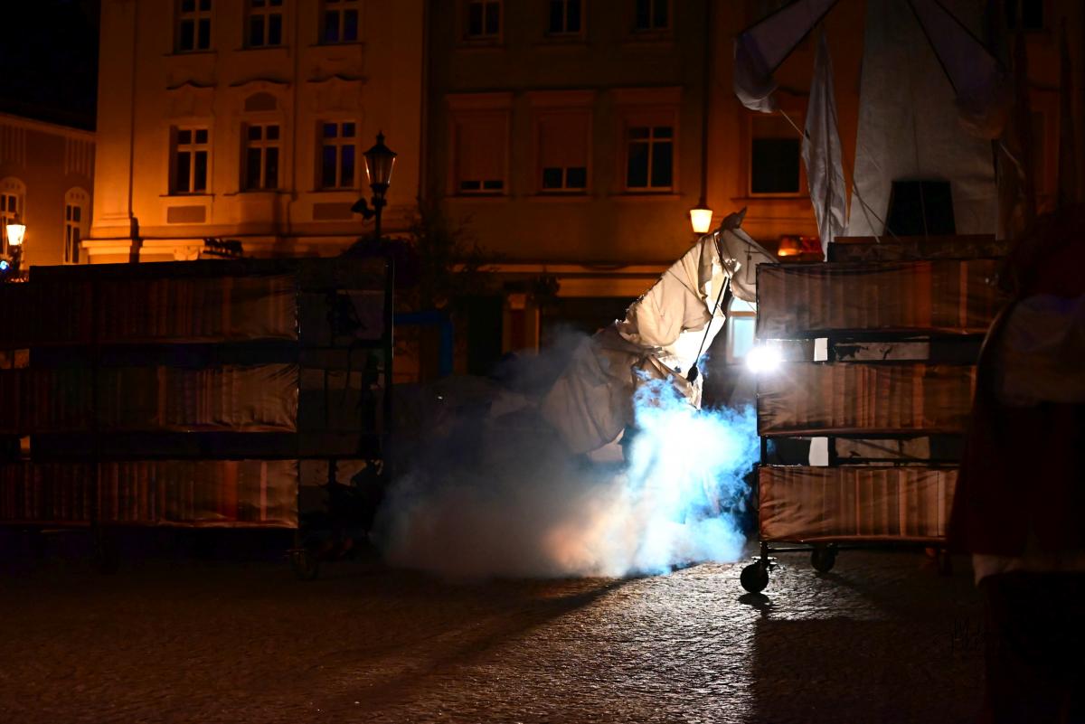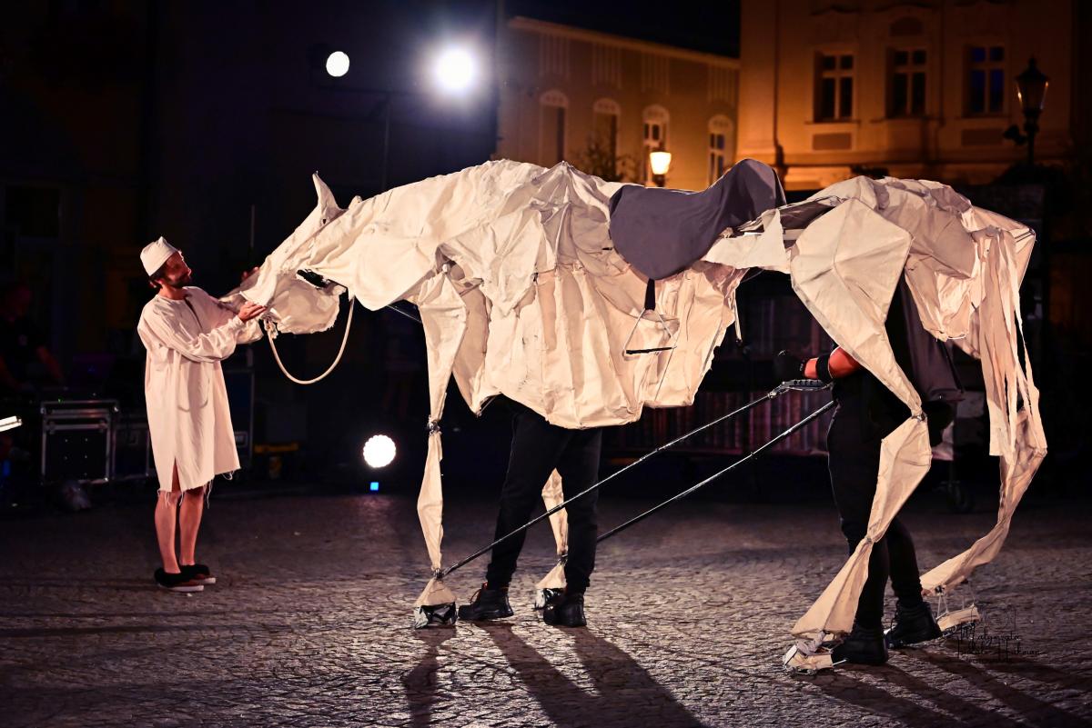 Widowisko w reżyserii Jakuba Kabusa, który jednocześnie odpowiada za scenariusz (wraz z Grzegorzem Żyłą), scenografię (we współpracy z Markiem Sobieskim) oraz inscenizację, to artystyczna podróż przez świat absurdu, marzeń i społecznych masek. W przedstawieniu wykorzystano widowiskowe elementy ulicznego teatru – ogień, gigantyczne machiny i lalki – z których na szczególną uwagę zasługuje imponująca konstrukcja konia autorstwa Tomasza Frąszczaka.