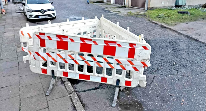 Dziura w rejonie studzienki na ul. Parkowej, do której niedawno wpadła śmieciarka, po deszczach znowu się objawiła. Na nic zdało się zasypanie jej tłuczniem. Tym razem służby ogrodziły ją barierkami. Czekają na zlecenie, aby to naprawić.