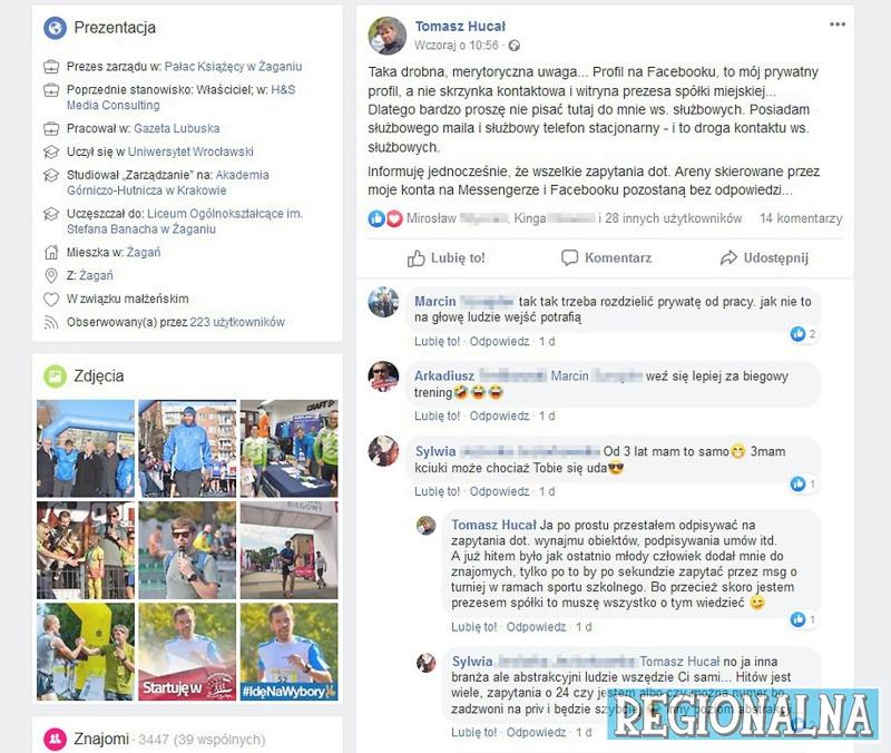 Tomasz Hucał wie, jak się zaprezentować w internecie! Tym, że jest prezesem zarządu Pałacu Książęcego, chwali się na swoim profilu na Facebooku. Na tym samym, na którym poucza, że to jego prywatny profil i żeby nie zawracać mu tam głowy służbowymi sprawami. A to wszystko w godzinach tak zwanej pracy. Taka ciekawostka!