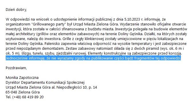 Warte odnotowania jest jeszcze coś innego. Mianowicie M. Zapotoczna dopuściła się nadużycia. Poniżej publikujemy całą odpowiedź (nie na temat) rzeczniki Zapotocznej, która w ostatnim zdaniu napisała, że „nie wyrażamy (red. chyba ona i prezydent?) zgody na publikowanie części bądź fragmentów tej odpowiedzi”. Zapomniała chyba, że nie przygotowywała odpowiedzi dla Łącznika Zielonogórskiego (miejskiej tuby).
