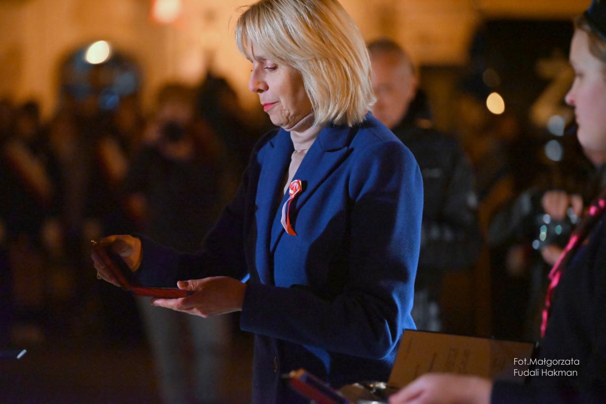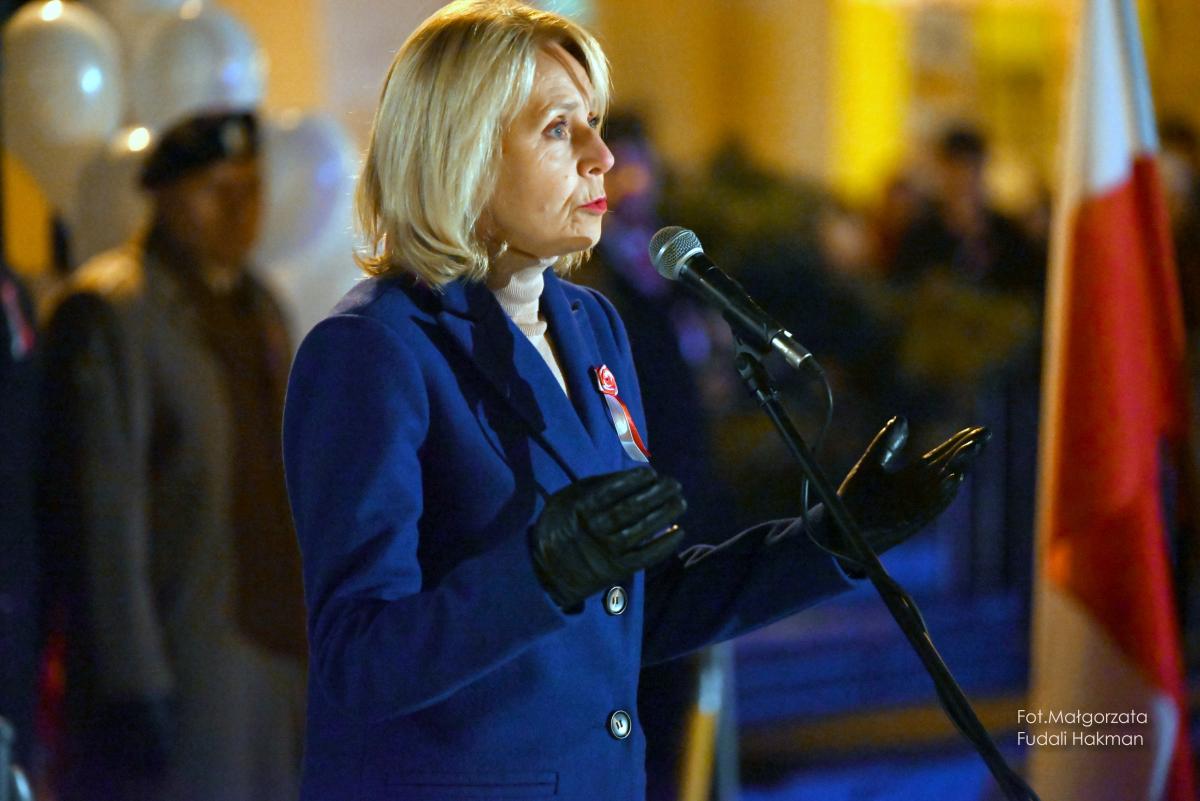 Na placu przed ratuszem zgromadzili się mieszkańcy Żar do których słowa z okazji święta skierowała burmistrz miasta Danuta Madej.