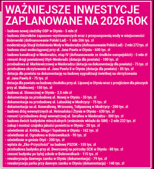 Budżet na sesji w Otyniu przedstawiła radnym burmistrz Barbara Wróblewska. Planuje się, że dochody gminy osiągną w 2026 roku 61 mln 467 tys. zł. Wydatki to 70 mln 603 tys. zł. Burmistrz zwróciła uwagę, że aż 23 mln 704 tys. zł to inwestycje (podajemy je w ramce). Zaplanowano deficyt w wysokości 9,1 mln zł, który zostanie pokryty z nadwyżki z lat ubiegłych (2 mln zł) , niewykorzystanymi środkami (92 tys. zł) i kredytem (7 mln zł). Burmistrz przypomniała, że w budżecie 2025, też planowany był kredyt na 5 mln zł. W trakcie roku rada podejmowała nawet uchwałę w sprawie zaciągnięcia kredytu, ale okazało się, że skarbniczka spięła budżet bez pieniędzy z banku. M.in. dlatego, że gminie udało się odzyskać podatek Vat w wysokości 2,6 mln zł. Na sesji budżetowej wykasowano nawet uchwałę w sprawie pożyczki. Burmistrz wyliczała, że był to czwarty rok z rzędu, gdy nie trzeba było zaciągać kredytu.