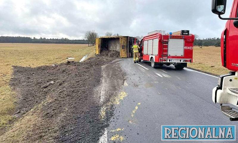 Przy wyprzedzaniu jedna ciężarówka zepchnęła z drogi drugą. Ta się przewróciła. W efekcie trasa pomiędzy Żarami a Straszowem zablokowana była przez kilka godzin.