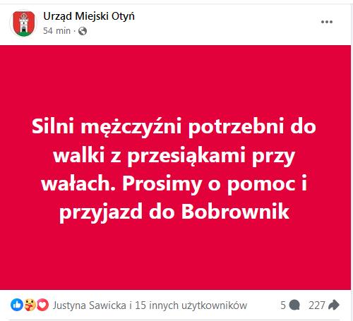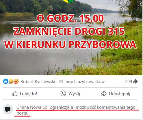 Tymczasem mieszkańcom gminy wiejskiej Nowa Sól nie spodobało się, że urząd gminy zablokował możliwość komentowania postów informujących o stanie powodziowym.
