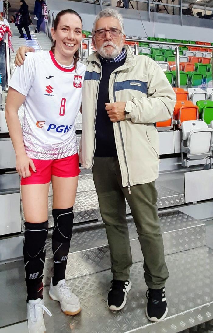 Monika Kobylińska i Tadeusz Płóciennik na meczu reprezentacji Polski w piłce ręcznej.