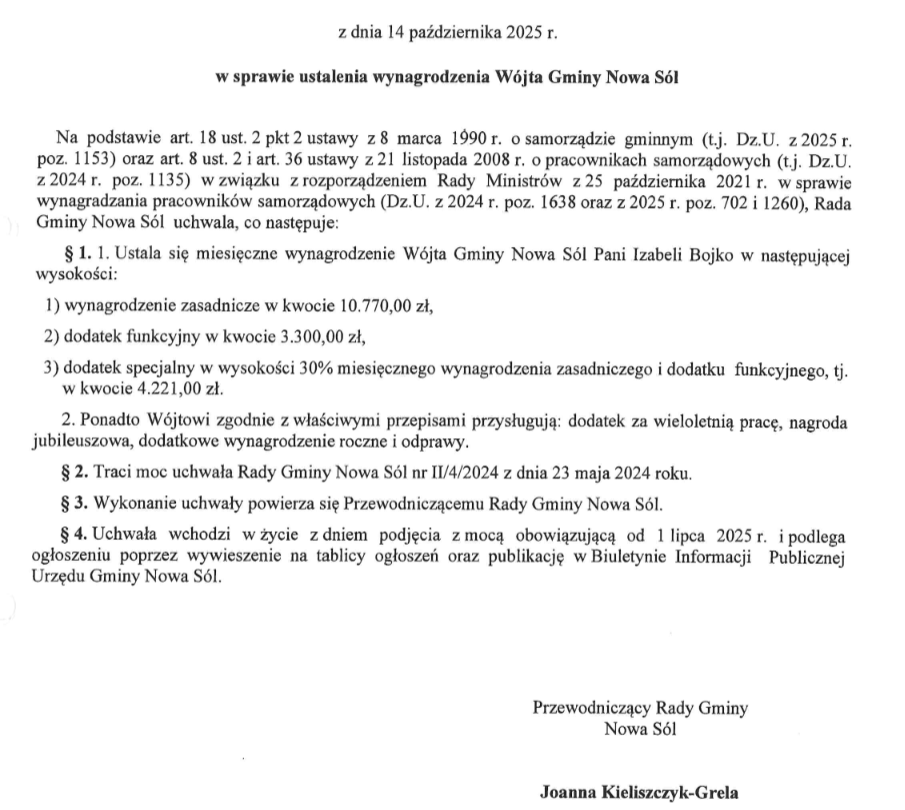 Czemu w ogóle Rada Gminy podnosiła pensję I. Bojko? Najprostsza dopowiedź brzmi: bo mogła. Rada Ministrów 15 września podjęła decyzję, że górne widełki wynagrodzeń dla prezydentów, wójtów, burmistrzów, marszałków, armii urzędników utrzymywanych z podatków mają iść o 5 proc. do góry. To wcale nie obligowało radnych, żeby podnosić wynagrodzenie wójt, mogli pozostawić je bez zmian. Ale skoro była taka możliwość, to błyskawicznie z niej skorzystano. To samo zrobiono zresztą w Nowej Soli przy pensji prezydent Beaty Kulczyckiej.