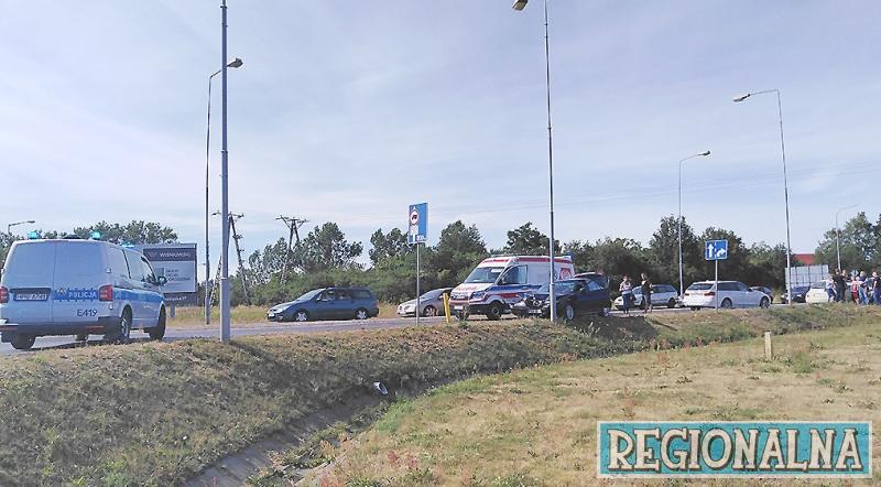 Wypadek spowodował 43-letni mężczyzna z powiatu żarskiego, który zbliżając się do ronda zjechał na przeciwległy pas. Przeciął drogę prawidłowo jadącej 35-latce, z którą w aucie podróżowała 13-letnia dziewczynka. Auta z impetem w siebie wjechały. Na miejscu pojawiły się karetki i policja. Dziewczynka została zabrana na SOR 105. Szpitala Wojskowego, gdzie lekarze nie stwierdzili poważniejszych obrażeń. Kierowcy byli trzeźwi. Sprawca został ukarany mandatem w wysokości 220 zł.