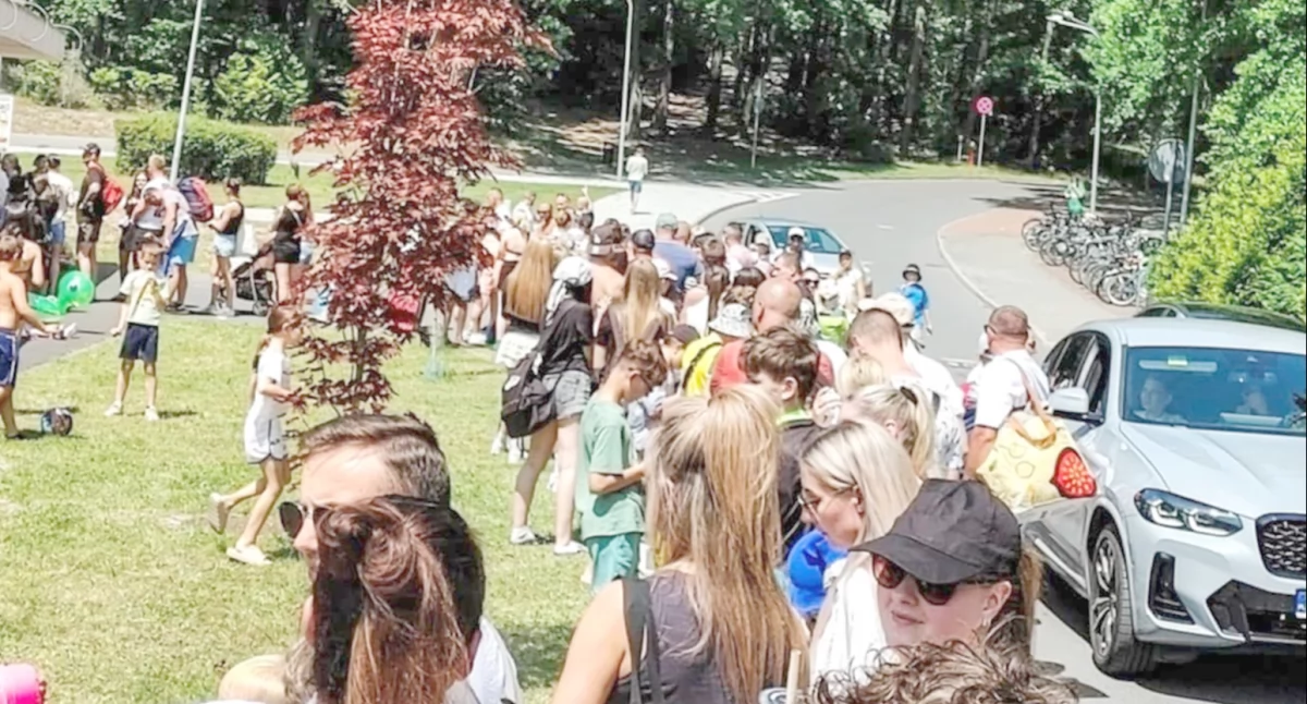 Za wodą dla ochłody! W rekordowo upalne dni basen przy ulicy Źródlanej w Żarach przeżywa prawdziwe oblężenie. Chętnych na kąpiel nie brakuje, brakuje za to kas, które przyspieszyłyby obsługę klientów.