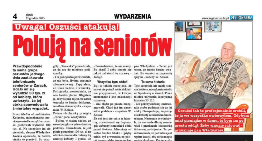 Jednego dnia prawdopodobnie ta sama grupa oszustów zaatakowała telefonicznie seniorów w Żarach. Udało im się wyłudzić 50 tys. zł od kobiety, która uwierzyła, że jej córka spowodowała śmiertelny wypadek. Telefon odebrał też pan Władysław, mieszkaniec żarskiego osiedla muzyków. Oszuści próbowali wyłudzić od niego 100 tys. zł, bo wmówili mu, że przez ich 14-letnią wnuczkę zginęła kobieta w ciąży.